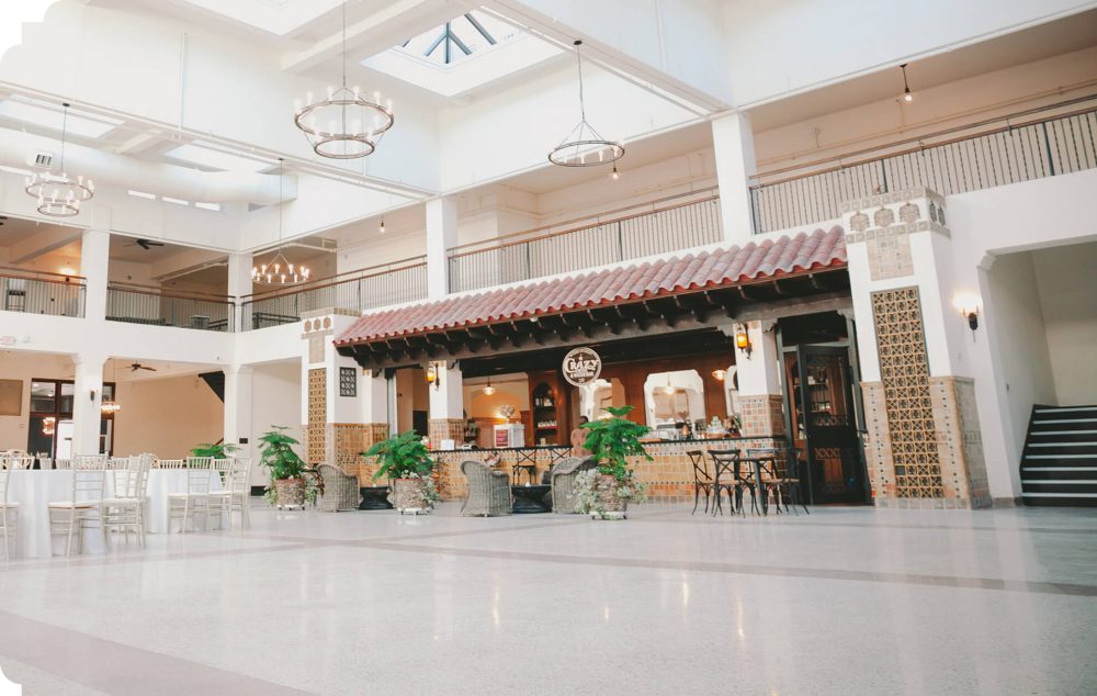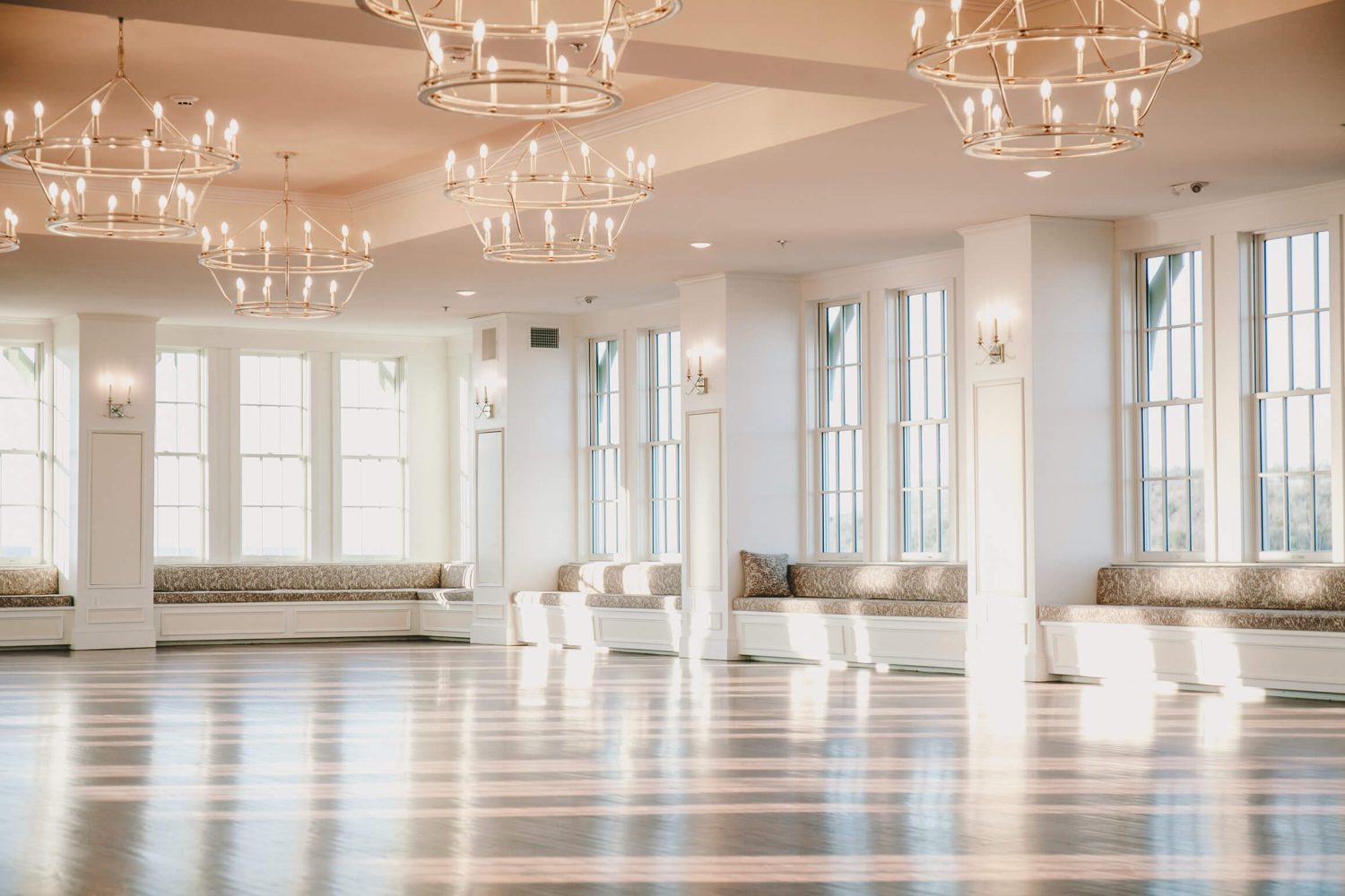 Our beautiful ballroom space is more than 3,000 sq. ft. of historic charm. It has an immense amount of natural light that floods in and coats every inch of this space. From the chandeliers to the sconces and down to the wood floors, every detail has been carefully curated to recreate the historical charm of the original hotel.